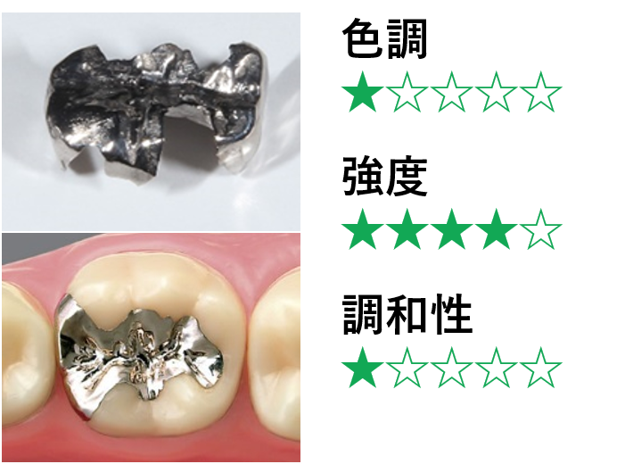 - 金属部分は強度があり割れることはないが、歯に負担がかかりやすく、適合性が悪いため虫歯になりやすい